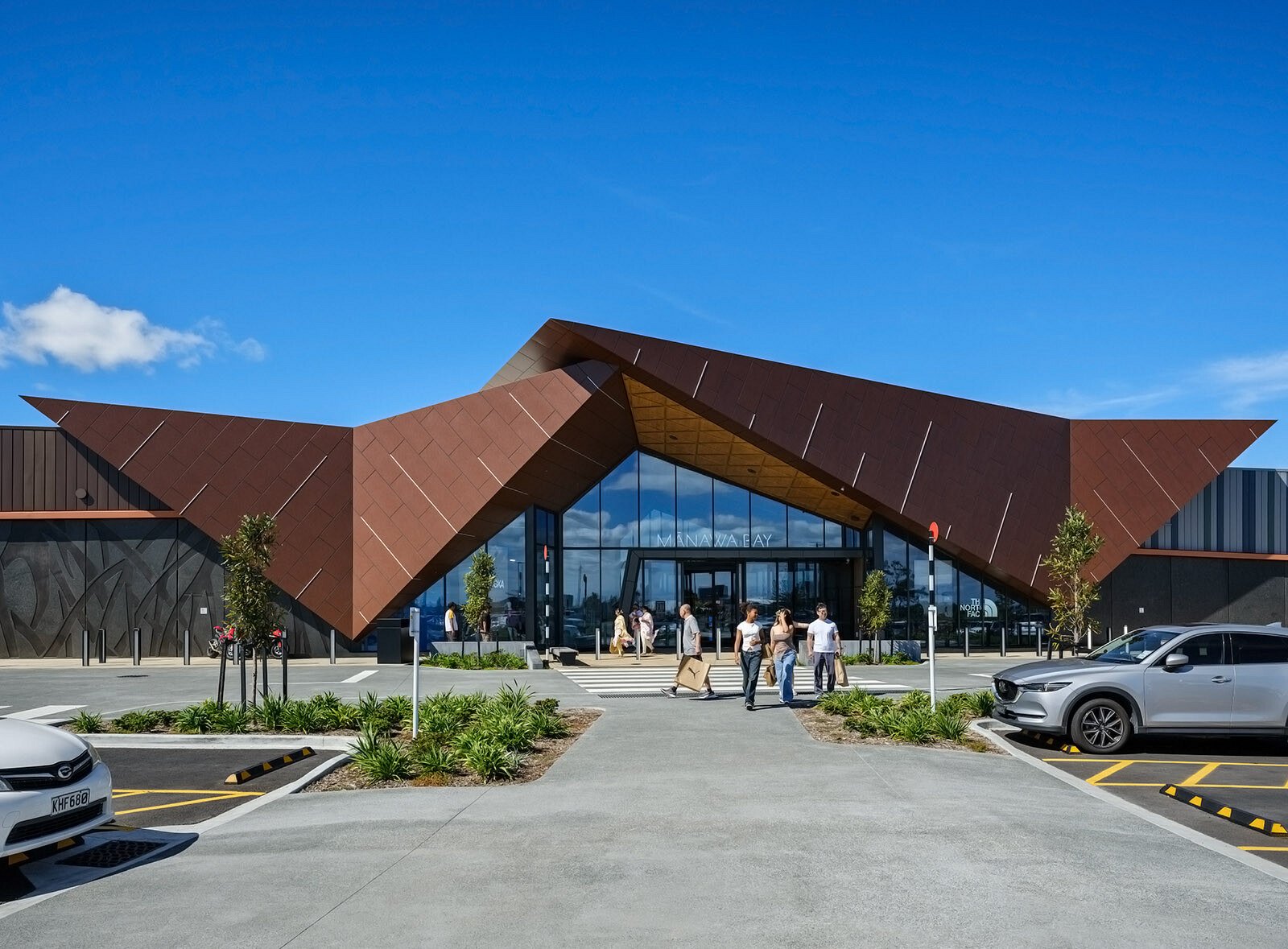 This sensitivity and engagement with Pūkaki Creek also defined the aesthetics of the building. Mangrove inspired designs are imprinted along the precast concrete panels, whilst the striped cladding above adds further texture with colours picked from the surrounding landscape. In the interior, soft furnishings and the ablutions follow material palettes grouped into three themes, shoreline, shells and mangroves. Timber furniture and the geometric ceiling above the foodcourt soften the space by providing a natural warmth.